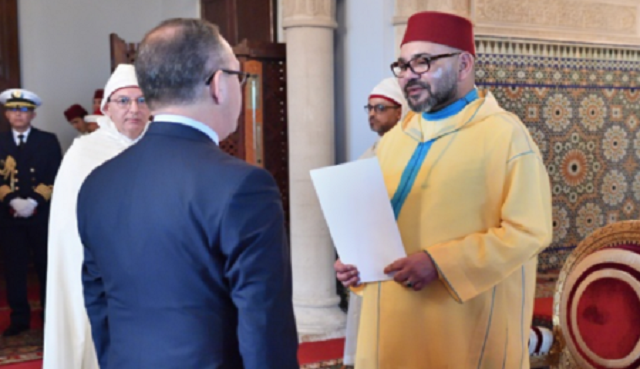 استقبل الملك محمد السادس بالقصر الملكي بالرباط، مساء اليوم الثلاثاء، عددا من السفراء الجدد بالبعثات الدبلوماسية للمملكة، و الذين سلمهم الملك ظهائر تعيينهم. و يتعلق الأمر بكل من: محمد بنشعبون، سفير لدى الجمهورية الفرنسية ، كريم مدرك، سفير لدى مملكة السويد و جمهورية لاتفيا ،الحسن الناصري، سفير لدى جمهورية السنغال و جمهورية غامبيا و جمهورية غينيا بيساو و جمهورية الرأس الأخضر، دريس اسباين، سفير لدى جمهورية مالي ، زكرياء الكوميري، سفير لدى جمهورية تنزانيا المتحدة و جمهورية القمر المتحدة، محمد بصري، سفير لدى مملكة الأراضي المنخفضة (هولندا)، محمد الصبيحي، سفير لدى جمهورية اليونان و جمهورية قبرص، عبد الرزاق لعسل، سفير لدى جمهورية كينيا و جمهورية جنوب السودان، بشرى بودشيش، سفيرة لدى جمهورية بنما وسن الزيلاشي، سفيرة لدى كومنولث أستراليا و نيوزيلاندا و توفالو و جمهورية كيريباتي و بابوا غينيا الجديدة ،علي ابن عيسى، سفير لدى دولة الكويت، عبد الرحيم رحالي، سفير لدى مملكة التايلاند، هشام دحان، سفير لدى جمهورية الدومينيكان و جمهورية هايتي ،عبد الرحيم مزيان، سفير لدى دولة فلسطين، عصام طيب، سفير لدى جمهورية غينيا و جمهورية السيراليون، هشام العلوي، سفير لدى جمهورية كوبا، حكيم حجوي، سفير لدى المملكة المتحدة لبريطانيا العظمى و إيرلاندا الشمالية، نبيلة فريدجي، سفيرة لدى مملكة النرويج و جمهورية إيسلندا ، محمد رشيد معنينو، سفير لدى جمهورية كازاخستان و جمهورية طاجيكستان و تركمانستان و جمهورية قرغيزستان.