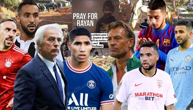 لا حديث مند ثلاثة أيام بمواقع التواصل الاجتماعي إلى على الطفل ” ريان” الذي لازال عالقا في بئر بقرية تمروت ضواحي شفشاون. الحملة التضامنية شملت عدد من المشاهير الرياضيين عبر العالم ومن بين هؤلاء المشاهير الذين عبروا عن دعمهم للطفل ريان، نجم المنتخب المغربي لكرة القدم أشرف حكيمي و نجم المنتخب الجزائري رياض محرز اللذان أعربا عن أملهما بإنقاذ الطفل ريان في تدوينتين على إنستغرام و فيسبوك. بالإضافة إلى حكيمي و محرز، نجد كل من الفرنسي هيرفي رينار مدرب المنتخب المغربي السابق و المعلق الجزائري حفيظ الدراجي و مدرب المنتخب الوطني الحالي وحيد خاليلوزيتش و المهدي بنعطية، و زهير فضال ، و يوسف النصيري و فرانك ريبيري ، بالإضافة إلى اللاعب يوسف النصري و رومان سايس و سليم أملاح و نايف أكرد، وغيرهم كثير من نجوم الكرة.