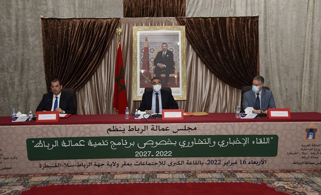 احتضنت القاعة الكبرى للاجتماعات بمقر ولاية جهة الرباط سلا القنيطرة أشغال اللقاء الإخباري و التشاوري بخصوص برنامج تنمية عمالة الرباط 2022/2027 و ذلك يوم الأربعاء 16 فبراير 2022 تحت رئاسة السيد محمد اليعقوبي والي جهة الرباط سلا القنيطرة، عامل عمالة الرباط و السيد عبد العزير الدرويش رئيس مجلس عمالة الرباط و بحضور السادة نواب الرئيس و السيد كاتب المجلس و السادة رؤساء اللجن الدائمة و نوابهم. كما عرف حضور المصالح الخارجية للقطاعات الحكومية المعنية و بعض جمعيات المجتمع المدني.
