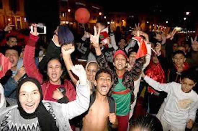 سماء الشارع المغربي تزين بالألعاب النارية في أمسية تاريخية للمشجعين الذين توافدوا بكثافة على الفضاءات العامة الرئيسة من أجل تقاسم فرحة الفوز مع بعضهم البعض. ففي مدينة الدار البيضاء انطلقت الجماهير المغربية بمجرد نهاية المباراة من المقاهي إلى “كورنيش عين الذئاب”، فيما احتشدت فئات عريضة من “البيضاويين” في شوارع العاصمة الاقتصادية للمملكة، و ملأت مركز المدينة، فرحا و ابتهاجاً بهذا الإنجاز التاريخي في كأس العالم.