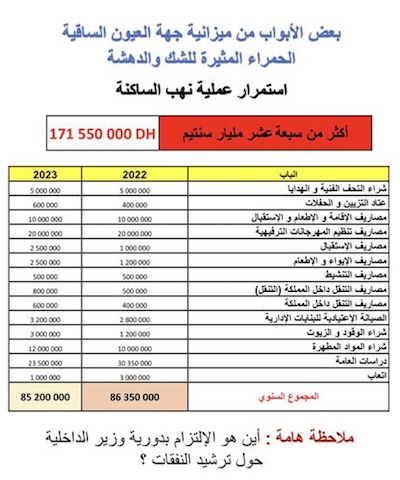 كشف حسن الدرهم رجل الأعمال و عضو مجلس جهة العيون الساقية الحمراء، عبر حسابه الرسمي على “فايسبوك”، تفاصيل عن الميزانية السنوية 2023 للجهة التي يرأسها حمدي ولد الرشيد، إذ خصص مبلغ 500 مليون سنتيم لشراء التحف الفنية و الهدايا، و 60 مليون للعتاد و التزيين و الحفلات، و مليار سنتيم كمصاريف للإقامة و الإطعام و الاستقبال، فضلا عن 2 مليار سنتيم كمصاريف لتنظيم المهرجانات.
