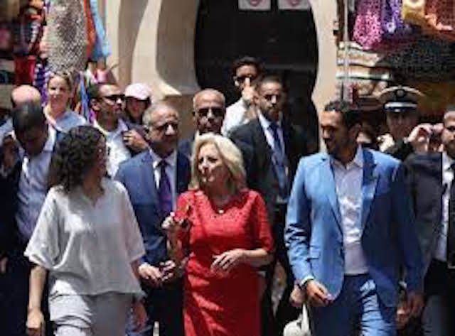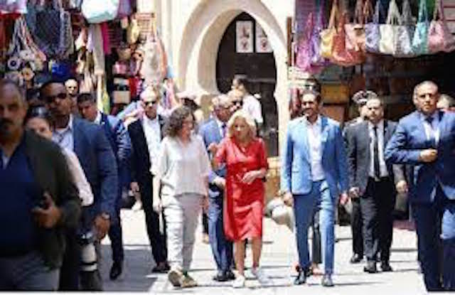 بعد وصولها أمس السبت إلى المغرب، قامت السيدة الأولى للولايات المتحدة الأمريكية، جيل بايدن، اليوم الأحد، بزيارة مجموعة من المآثر التاريخية. و خلال زيارتها لمختلف فضاءات هذه المؤسسة التاريخية و التربوية، قدمت للسيدة الأولى للولايات المتحدة الأمريكية شروحات حول هذا الموقع التاريخي و المعماري الخلاب، الذي يشهد على حقبة مشرقة من التاريخ العريق للمملكة. السيدة الأولى زارت منتصف النهار مدرسة بن يوسف، أحد أشهر المواقع الثقافية و التاريخية في المدينة، و قُدمت لها شروح حول هذه المؤسسة التي أحدثت عام 1565 كمركز للتربية و التعليم الإسلامي، و كانت بمثابة كلية دينية تستضيف طلاباً من مختلف أرجاء شمال إفريقيا و خارجها.