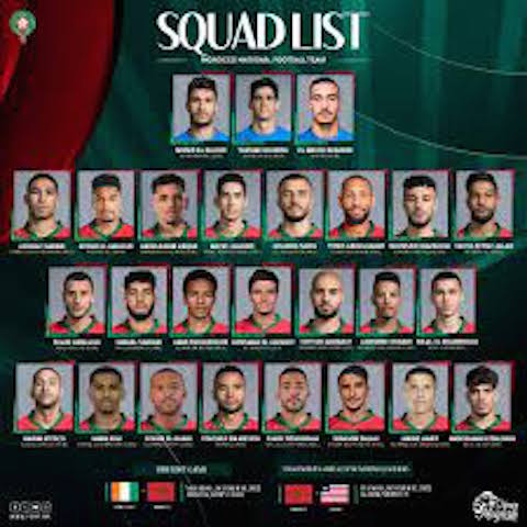 خط الدفاع.. أشرف حكيمي (باريس سان جيرمان الفرنسي)، أيوب العملود (الوداد الرياضي)، نصير مزراوي (بايرن ميونيخ الألماني)، نايف أكرد (ويست هام الانجليزي)، رومان سايس (الشباب السعودي)، يونس عبد الحميد (رينس الفرنسي)، يحيي عطية الله (الوداد الرياضي)، عبد الكبير أبقار (ألافيس الإسباني).