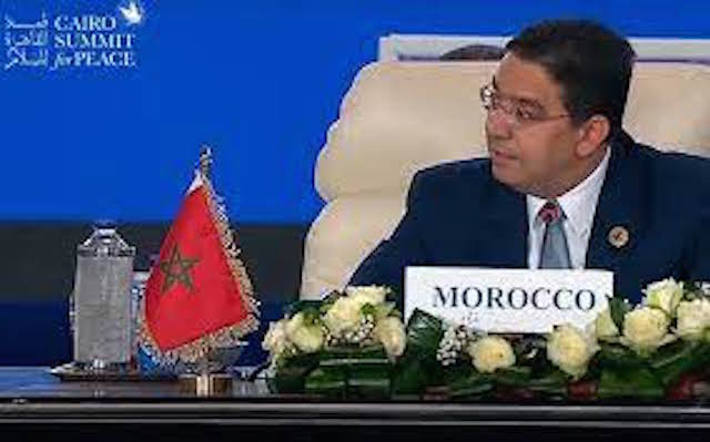 أكد ناصر بوريطة وزير الشؤون الخارجية و التعاون الإفريقي و المغاربة المقيمين بالخارج، خلال كلمته بـ قمة القاهرة للسلام، ضرورة وقف الاعتداءات الإسرائيلية على المدنيين الأبرياء في غزة و عدم استهدافهم وفقا للقانون الدولي و إيصال المساعدات الإنسانية إلى القطاع. كما أكد بوريطة رفض كل الحلول و الأفكار لتهجير المواطنين الفلسطينيين إلى خارج أرضهم بما يهدد أمن الدول المجاورة. و أشار إلى أن المملكة المغربية تعمل على تحقيق السلام بالتعاون مع الجهود المصرية لوقف الأعمال العدائية تجاه الشعب الفلسطيني.