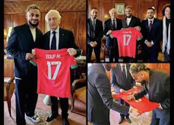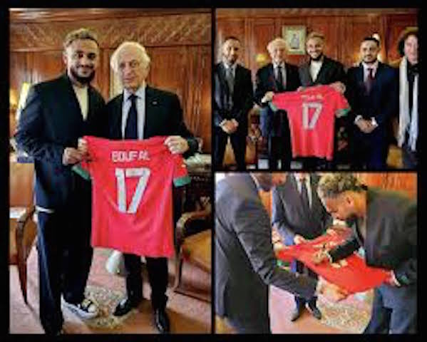 استقبل المستشار الملكي أندري أزولاي، أول أمس الاثنين بالقصر الملكي بالرباط، الدولي المغربي سفيان بوفال، لاعب نادي الريان القطري لكرة القدم. و ظهر سفيان بوفال رفقة المستشار الملكي، في مجموعة من الصور التي وثقت الزيارة التي قام بها، حيث أهدى الدولي المغربي، قميصه ذو الرقم 17 في المنتخب الوطني موقعا لأندري أزولاي. و تداول العديد من رواد مواقع التواصل الاجتماعي، العديد من الصور التي يظهر من خلالها سفيان بوفال رفقة المستشاز الملكي، حيث أهدى النجم المغربي قميصه لأندري أزولاي. و جدير بالذكر أن سفيان بوفال حل بمدينة مراكش خلال الأسبوع الماضي، حيث نشر العديد من الصور، عبر حساباته الرسمية على مواقع التواصل الاجتماعي، من أجل توثيق إجازته بمراكش.