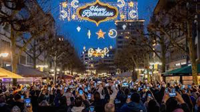في سابقة من نوعها بألمانيا، اكتست مدينة فرنكوفرت بألمانيا، حلة البهاء و الجمال، احتفاء بشهر رمضان المبارك. حيث زينت الشوارع بأضواء تحمل زينة رمضان من نجوم و فوانيس، علاوة على لافتة كبيرة تزف التبريكات “رمضان مبارك”. ففي حفل أُقيم مساء أمس الأحد، كشف رسميا عن لافتة كبيرة كتب عليها “رمضان مبارك”، و عرض للأضواء على شكل نجوم و فوانيس أضاءت شارعا للمشاة بوسط المدينة يعج بالمطاعم و المقاهي. و ذكرت السلطات المحلية و وسائل الإعلام الألمانية أنها المرة الأولى التي تضاء فيها مدينة ألمانية خلال شهر رمضان.