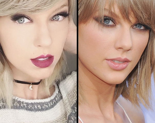 من اليمين إلى اليسار: تايلور سويفت وشبيهتها خبيرة التجميل الأمريكية ابريل غلوريا.