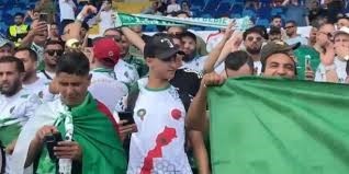 في المباراة التي جمعت المنتخب الجزائري و نظيره الغيني اليوم الاثنين على أرضية ملعب محمد الخامس بمدينة الدار البيضاء لحساب التصفيات الأفريقية المؤهلة لنهائيات كأس العالم 2026، التقطت عدسات المصورين صورة لأحد المشجعين المغاربة يرتدي القميص الوطني و هو مزين بخريطة المملكة وسط الجماهير الجزائرية.