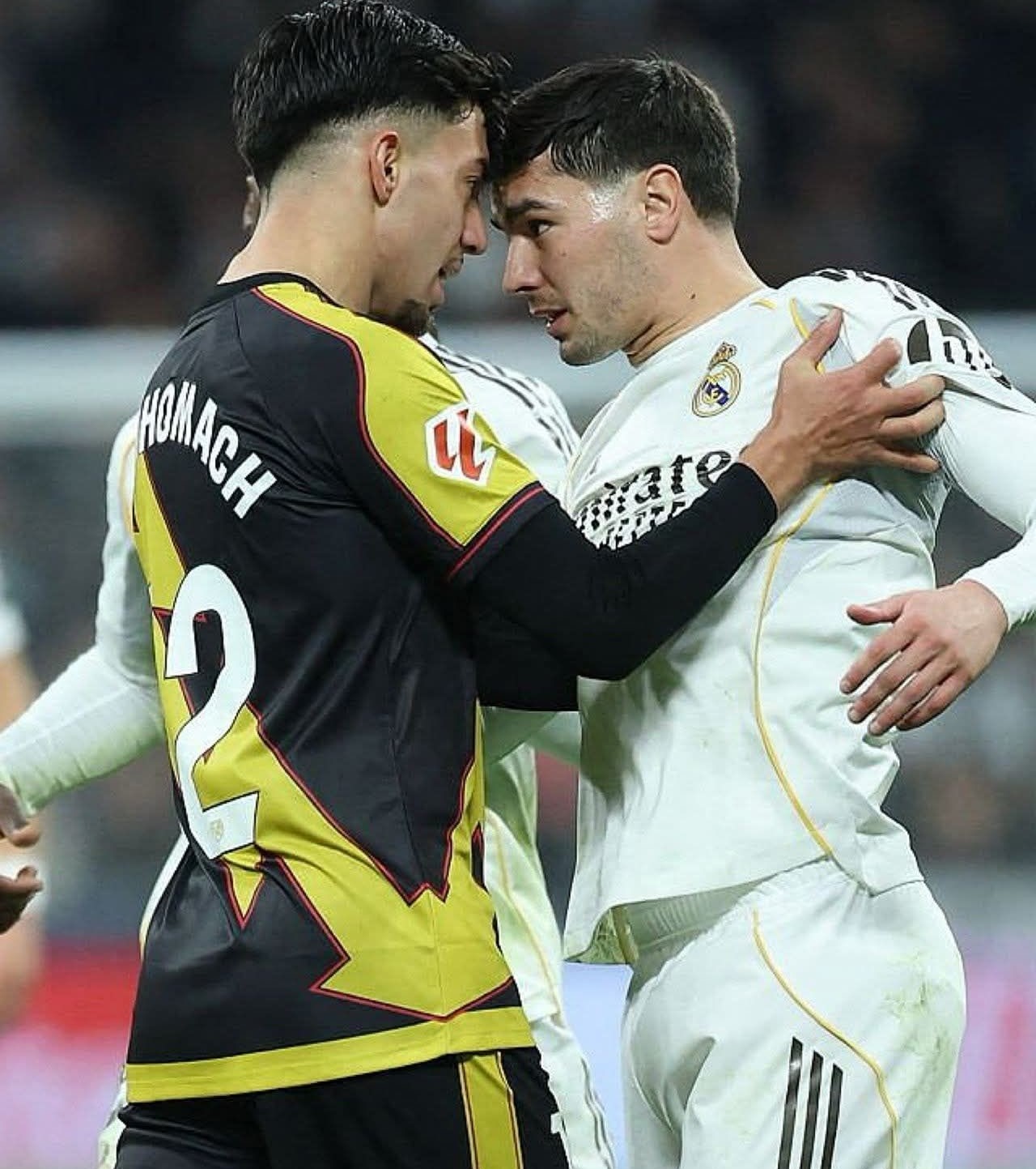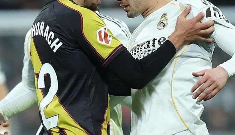 شهدت مباراة نادي ريال مدريد و نظيره رايو فايكانو، التي احتضنها ملعب “سانتياجو برنابيو” مساء اليوم الأحد، واقعة أثارت الكثير من الحبر في الأوساط الرياضية المغربية و الإسبانية على حد سواء حيث نشبت مشادة كلامية و تدافع بالأيدي بين النجم إبراهيم دياز و أخوماش زميله في منتخب المغرب. و بالقرب من منطقة جزاء النادي الضيف، وجه دياز كلمات قاسية لأخوماش قبل أن يتطور الأمر لتبادل الدفع، مما استدعى تدخلا فوريا من لاعبي “الميرينجي” إدواردو كامافينجا و فيديريكو فالفيردي لإنهاء الخلاف قبل تطوره. لم تكن القمة الكروية التي احتضنها ملعب “سانتياجو برنابيو” مساء اليوم الأحد بين ريال مدريد و ضيفه رايو فايكانو مجرد مواجهة روتينية في “الليجا”، بل تحولت إلى مسرح لكشف النقاب عن أزمة صامتة تنهش جسد الكرة المغربية. المشهد الذي أصبح حديث العالم بين دياز و أخوماش لم يكن هدفا عالميا أو مراوغة ساحرة، بل كان شجارا “أخويا” مريرا بين نجم الملكي إبراهيم دياز و مواطنه في صفوف الضيوف إلياس أخوماش، في واقعة تجاوزت حدود التنافس الرياضي لتعكس احتقانا دفينا بين أبناء المنتخب الواحد.