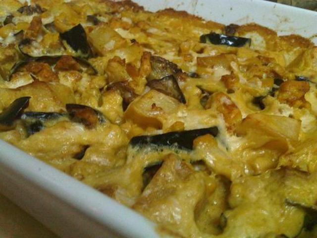تغطى الحشوة بطبقة من شرائح الباذنجان المتبقية، و تسكب فوقها كريمة الطبخ، و يرش الجبن على الوجه ثم تدخل الصينية إلى الفرن و تترك إلى أن ينضج الدجاج و الخضراوات جيداً، و يحمر الوجه.