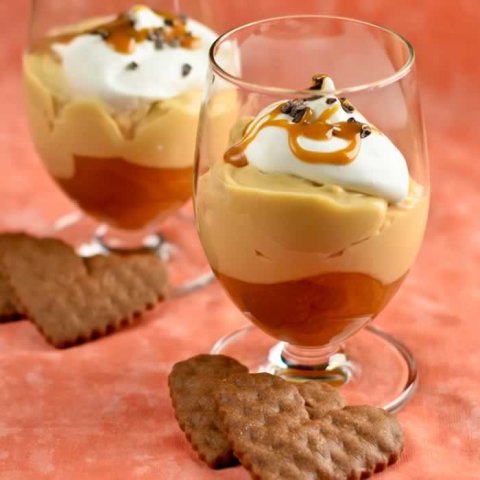 تزين الأطباق بخطوط من الكراميل و قليل من الشوكولاتة و تقدم بالصحة و الراحة.