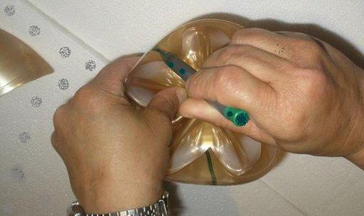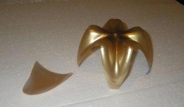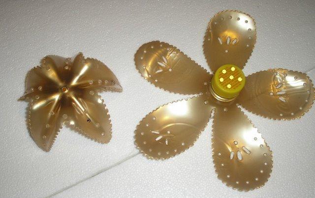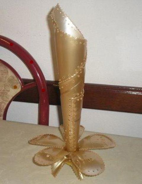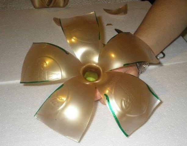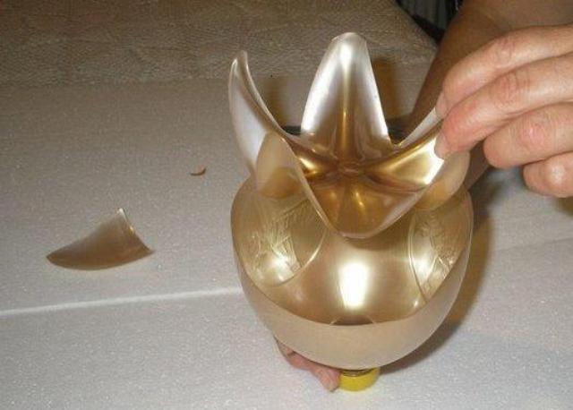قصي أسفل القارورة لمنحها لمسة جميلة بصباغة ذهبية للداخل و الخارج ثم قومي بتشكيلها حسب ذوقك أو حسب الصورة.