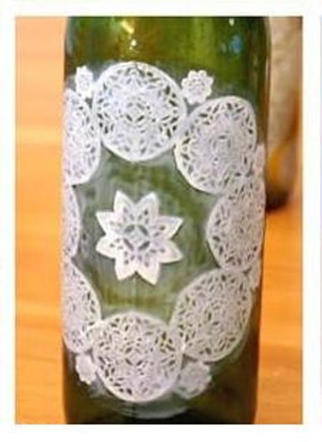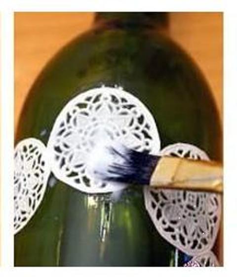 بعدها، اخذي قارورة زجاجية نظيفة و ألصقي فوقها التشكيلة التي اخترتها بواسطة الفرشاة و اللصاق.