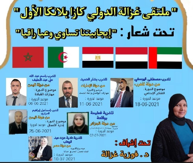 افتتح مركز غزالة للتدريب و اليوغا و العلاج الشمولي، تحت إشراف المدربة د. فوزية غزالة، دورته الأولى تحت عنوان “ملتقى غزالة الدولي كازابلانكا الأول و تحت شعار ” ايجابياتنا تساوي وعيا راقيا” . تبدأ الدوة من 06/06/2021 و تنتهي يوم 10/07/2021.