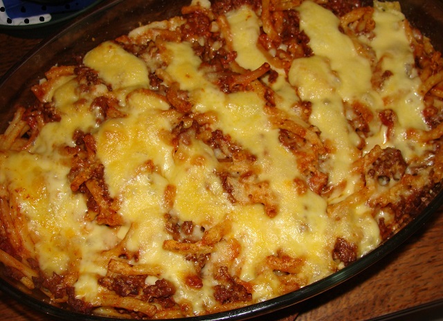 ادهني المول أو صينية الفرن بالزبدة و أضيفي قليل من صلصة البشاميل و طبقة من المعكرونة ثم صلصة بولونيز ثم قليل من البشاميل ثم طبقة أخيرة من المعكرونة و فوقها ما تبقى من البشاميل و رشي على الوجه الجبن الأحمر المحكوك و ادخلي الصينية للفرن على درجة 180 ° حتى يطهى الكراتان تماما و يذوب الجبن و قدميه بالصحة و الراحة.