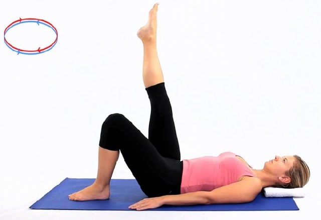 وجهّي أصابع قدميك بالاتجاه الأفقي و قومي برسم 12 دائرة في الهواء مع عملية التنفس، و أعيدي العملية بالتتابع الساق الأيمن ثم الساق الأيسر و هكذا ثم بدلّي بين الساقين.